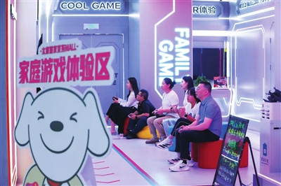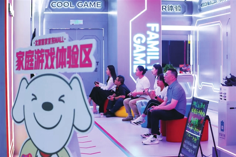 为了拉动线下消费,我市实体店纷纷推出体验式消费。图为7月10日消费者在京东MALL家庭游戏体验区体验。王韵菲 摄