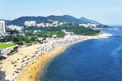 近日,辽宁省大连市持续高温天气,大连傅家庄公园海滨沙滩迎来大量游客,人们在海滨沙滩戏水消暑。