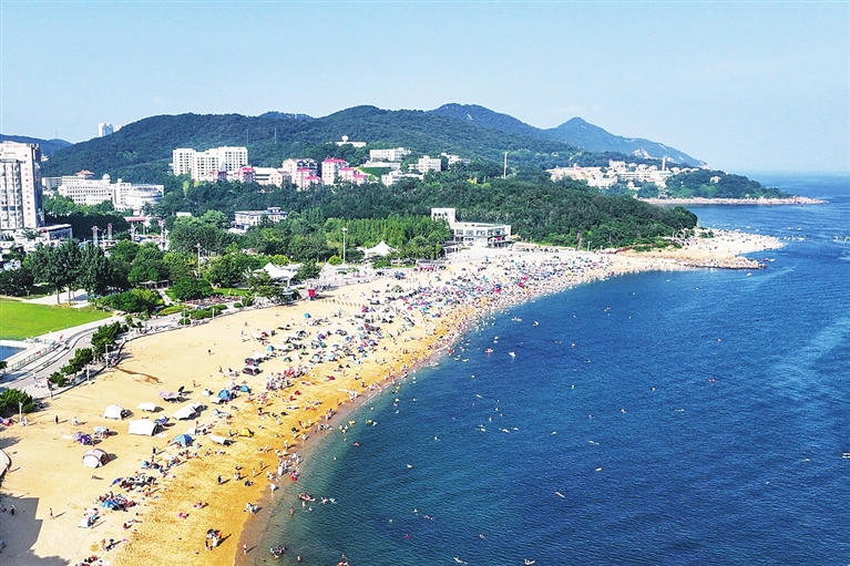 7月10日拍摄的大连傅家庄公园海滨沙滩(无人机照片)。