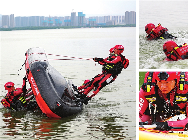 7月13日,汛期强降雨频繁,太原市消防救援支队特勤大队晋阳湖站组织全体队员加强水域救援专业训练,提升队伍的应急处置能力。王韵菲 摄