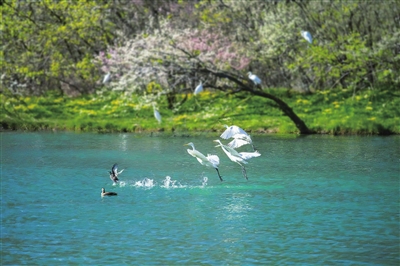 水质澄澈,是河流的灵魂。曾几何时,汾河蒙尘。而今,清流涤荡污浊,终于唤醒了沉睡的见证者——被誉为“活体水质检测器”的桃花水母,在四期水域轻盈旋舞,近乎透明的伞盖如精灵般浮动。清波之下,是万物生长的秘境;碧水之上,是羽翼的乐园。天鹅、白鹭、苍鹭、斑嘴鸭……上百种鸟儿于此栖息,它们翅膀的每一次扇动,都是对汾河生态最真实的肯定。骑行者在绿道上飞驰,身影融入两岸的锦绣;游人漫步木栈道,步伐隐没在流动的诗意里;沿岸居民推窗见绿,汾河终于找回了它清亮的歌喉。