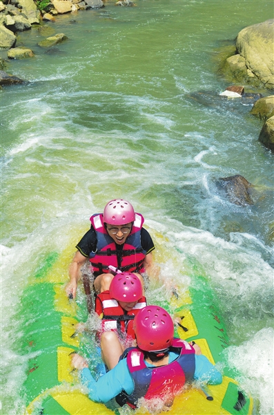 7月12日,游客在浙江省三门县珠岙镇仙人峡漂流。连日来,全国多地持续高温,催热暑期“清凉经济”,多样化消暑体验和消费场景释放夏日经济活力。新华社发(林利军 摄)