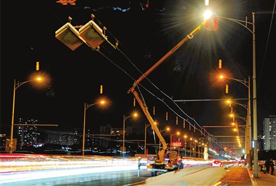 7月15日,太原市城市照明管理中心工作人员在胜利桥进行路灯设施整体更新,为市民营造安全、明亮的夜间出行环境。郭苑甫 摄