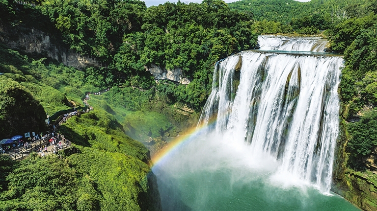 7月16日,游客在贵州省安顺市黄果树瀑布景区游览(无人机照片)。