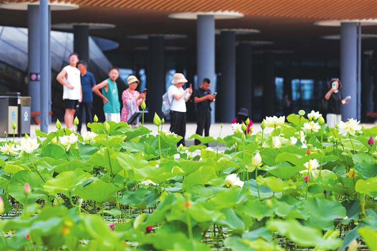 我市多处荷花竞相绽放,婷婷动人。图为7月17日,众多游客在太原植物园赏荷。王韵菲 张子怡 摄影报道