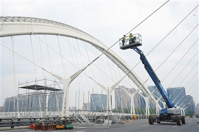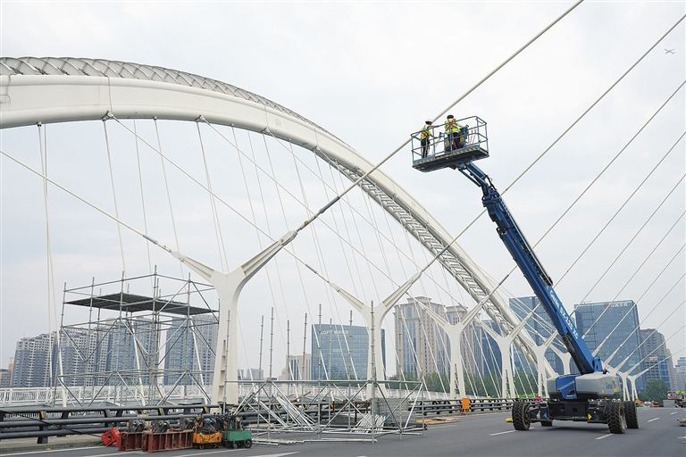 7月19日,施工人员对南中环桥桥梁钢锁进行工前检测,南中环桥主桥上耳板和悬索维修工程正式启动。施工采用同步对称更换的方式,旧斜拉杆拆除、安装焊接新上耳板及加强翼板、防腐处理、张拉新斜拉杆等工序交替展开,维修作业预计8月底完工。牛利敏 摄