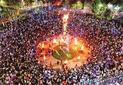 7月19日,在云南省大理白族自治州南涧彝族自治县彝族火把节的篝火晚会现场,游客与彝族群众一起欢度火把节(无人机照片)。连日来,云南多地欢度火把节,节日活动精彩纷呈,游客如潮。新华社发