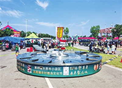 此次牺汤文化节在龙城服务区举办,采用黄河京都大酒店提供的获得大世界吉尼斯纪录的直径7米大锅,当日凌晨开始熬制,经过4个半小时熬好,供村民和游客分食。牺汤,源于古老的“牺牲”祭祀传统,最早可追溯至周代,选用上好羊肉(常为羯羊),配以秘制香料,经数小时慢火熬煮,汤色乳白,滋味醇厚,兼具温中补虚、驱寒祛湿的养生功效,承载着农耕文明祭祀祈福、顺应时令养生的智慧。辛村作为牺汤制作技艺的重要传承地,其熬汤技艺代代相传,形成了独特的地域风味和文化认同,是太原乃至山西饮食文化的一张特色名片。