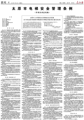 太原市人大常委会办公室向社会公开征集关于对《太原市电梯安全管理条例(草案征求意见稿)》意见的公告