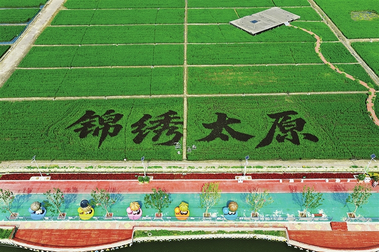 夏日的太原,处处绿意盎然。7月23日,俯瞰稻田公园,由彩色水稻组成的“锦绣太原”四个大字尽收眼底。该公园通过精密的设计与科学的田间管理,为游客提供了独特的视觉感受。王韵菲 摄