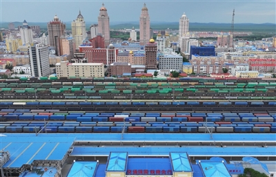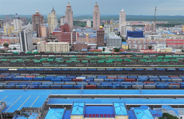 7月22日,中欧班列在中国铁路哈尔滨局集团有限公司满洲里站编组场等待发车(无人机照片)。2025年上半年,经中欧班列东通道通行班列达2444列,发送货物252340标箱。 新华社发