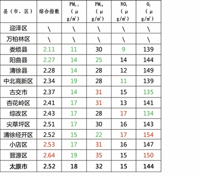 1.综合指数、PM10、NO2和O3指标排名前两位的标为绿色,排名后两位的标为红色;