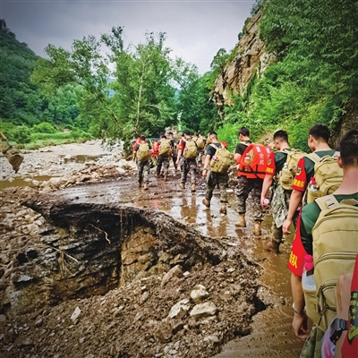 7月28日,武警北京总队官兵徒步10余公里前往怀柔区琉璃庙镇运送物资。