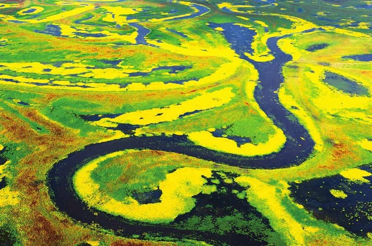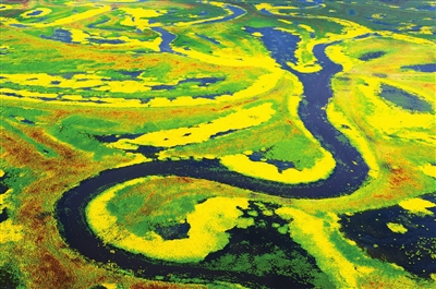 近日,黑龙江挠力河国家级自然保护区湿地中的驴蹄草盛开花朵,湿地仿佛披上了黄绿相间、色彩明艳的绸缎。新华社发(盛景利 摄)