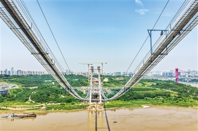 这是7月30日拍摄的重庆黄桷沱长江大桥主缆架设作业现场(无人机照片)。当日,黄桷沱长江大桥顺利完成主缆架设工作,标志着大桥建设即将进入钢桁梁吊装工序。黄桷沱长江大桥全长1260米,主跨765米,为单跨悬吊双塔三跨连续钢桁梁悬索桥,是国内最大跨径公轨两用悬索桥。黄桷沱长江大桥是渝长高速复线连接道工程的控制性节点工程,建成后将成为联系重庆主城区长江南北两岸的重要交通干道。新华社记者 唐 奕 摄