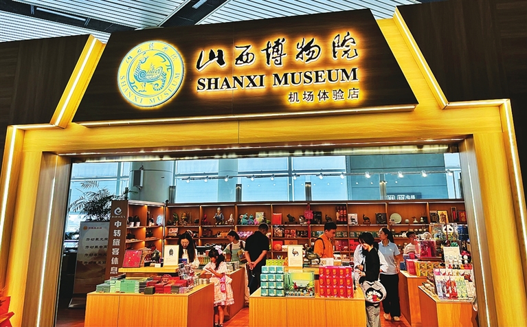 8月2日,山西博物院机场体验店内,旅客正在挑选文创产品。暑假期间,清凉游、亲子游、研学游需求旺盛,带动文创市场持续火热。邓寅明 摄