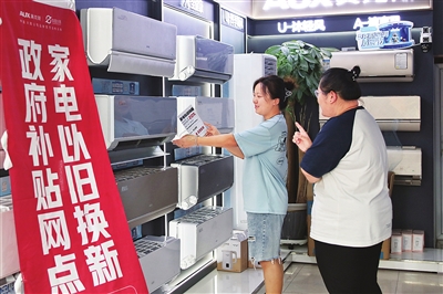 近日,受“高温+国补”共同影响,我市空调、冰箱等制冷家电迎来销售旺季。图为8月4日,解放路某空调专卖店的工作人员在向顾客介绍空调性能和国补政策。该店空调销量比上季度增长40%以上。张澍宏 摄