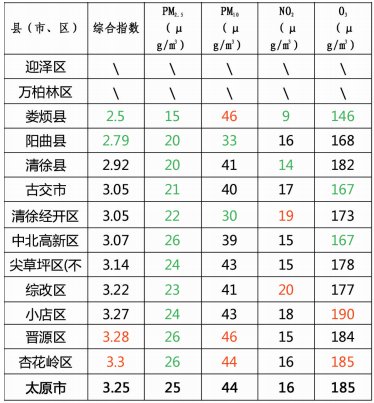 1.综合指数、PM10、NO2和O3指标排名前两位的标为绿色,排名后两位的标为红色;