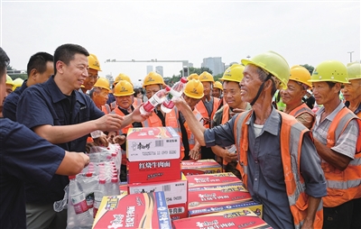此次慰问活动分五组,分别在迎泽大街西段地下管网更新改造工程、龙城污水处理厂工程、南中环桥主桥斜拉杆上耳板更换维修工程、新建路地下管网更新改造工程、胜利街改造工程五个重点工程工地开展慰问。慰问组将矿泉水、风油精、电解质饮料、西瓜等防暑降温物品送到一线施工人员手中,叮嘱大家注意防暑降温,确保身体健康。同时,慰问组对一线施工人员不惧高温、坚守岗位,为重点工程建设付出的努力给予高度赞扬和衷心感谢。