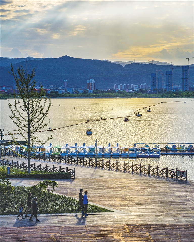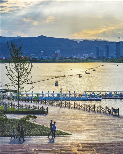 八月七日,二十四节气中的立秋,晋阳湖公园内树木葱绿,秋意初萌,市民在湖畔步道休闲纳凉。韩双喜 摄