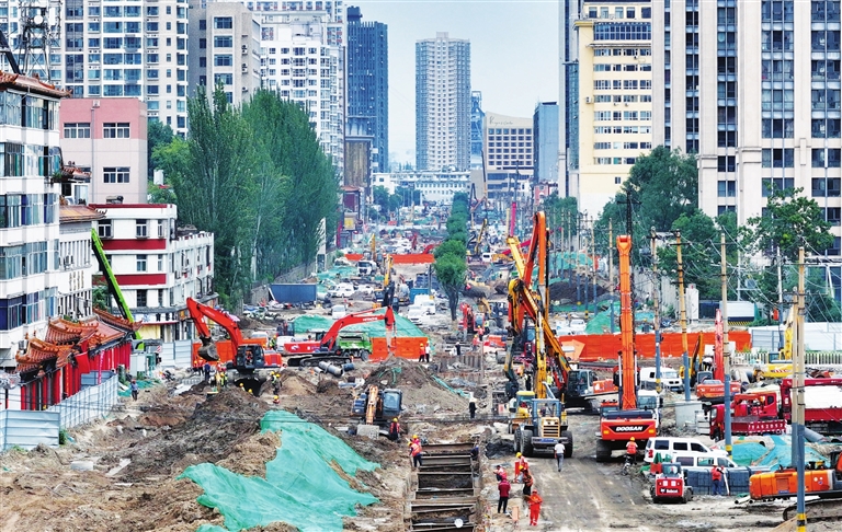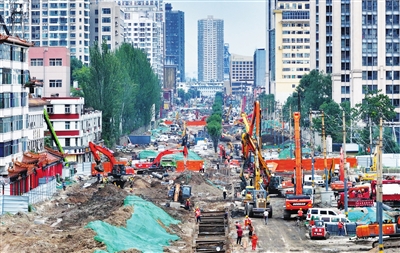 8月7日,新建路改造工程现场,施工人员冒酷暑、抢工期,加紧进行地下管网建设。牛利敏 李佩桁 摄影报道