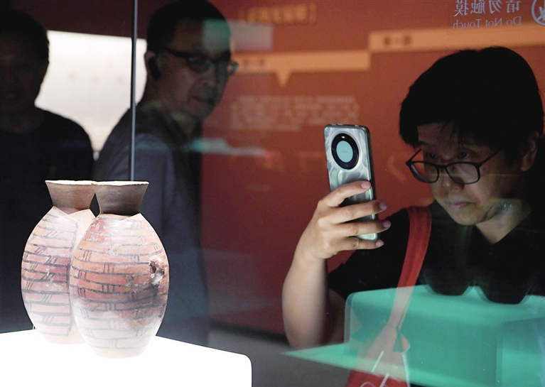 在大河村遗址博物馆新馆展厅C位,一件彩陶双连壶备受关注,引得不少游客驻足流连。