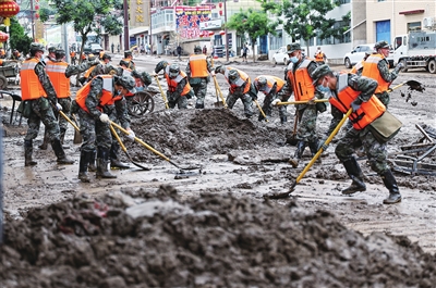 记者8日在救援现场看到,救援人员两人一组用绳子将彼此连接,背着铁锹蹚过泥水。他们背起受灾群众,将其转移至安全地带,有的推车清理淤泥,为后续救援开辟道路。