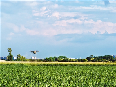 8月11日,小店区刘家堡乡西草寨村500亩玉米地上空,无人机正在进行施肥作业。相较于传统的人工施肥方式,无人机施肥具有播撒均匀、安全高效、省时省力等优势,并得到广泛运用。王韵菲 摄