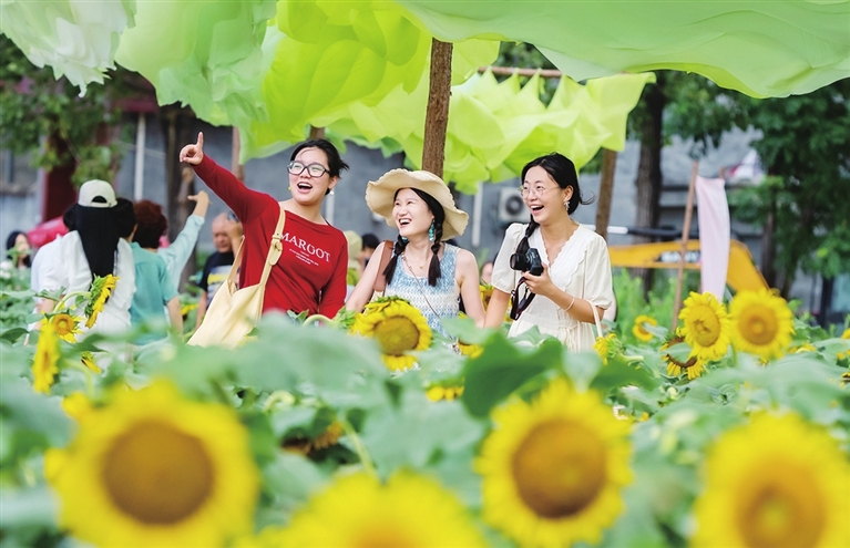 8月12日,游客在河南省驻马店市西平县老王坡产业融合发展示范区的百亩油葵花海游玩。正值暑期,人们游玩度假、休闲避暑,乐享美好时光。新华社发 (赵永涛 摄)