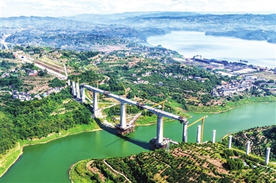 当日,由中国铁建大桥局承建的重庆至万州高速铁路(渝万高铁)渠溪河双线特大桥顺利合龙。渝万高铁渠溪河双线特大桥位于重庆市涪陵区珍溪镇,横跨长江支流渠溪河,全长约953米,是全线重难点工程。新华社记者 唐 奕 摄