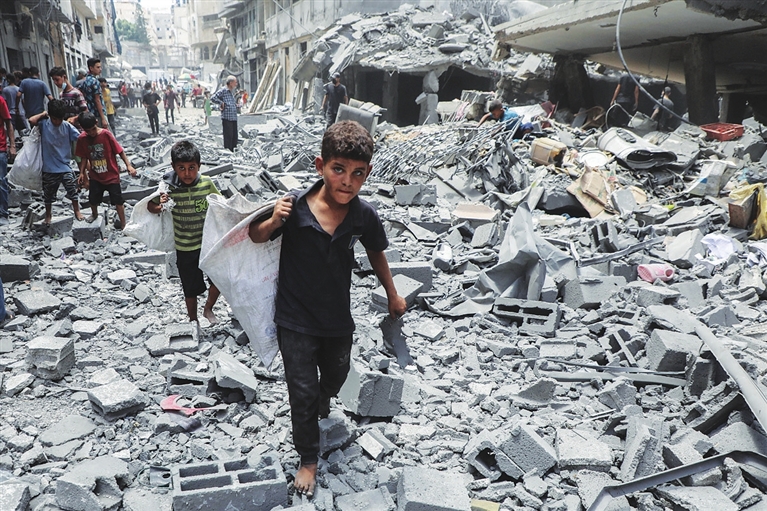 8月8日,孩子们在加沙城的废墟上搬运物品。