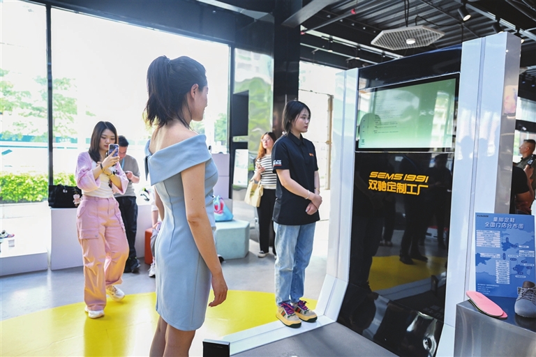 8月19日,消费者在福建莆田双驰科技定制工厂店体验脚型数据采集设备。在福建莆田的定制工厂,消费者只需脱下鞋袜、站上专用设备,面前的屏幕便会即时显示足长、足宽、足弓高度等多维脚型数据。基于这些数据,系统将自动生成个人专属鞋款定制模板,消费者随后可自主选择心仪的样式与花色。门店内的智能化流水生产线随即启动,直接进行个性化生产。最快仅需一个多小时,一双为消费者“量身打造”的新鞋即可打包带走。 作为莆田市的支柱产业之一,鞋服产业拥有制鞋及鞋材企业超过4200家,年生产能力突破12亿双。近年来,当地积极探索“品牌创新”与“智能制造”双轮驱动的发展路径,大力推动企业智能化改造和数字化转型,激发出新的活力。
