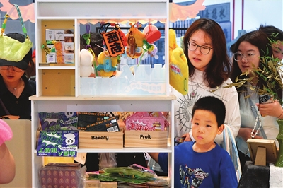 在平型关大捷景区展位前,锃亮的冲锋号、抗日纪念徽章、子弹型挂件、小人书《刘胡兰》等文创作品,以及视频里平型关大战突击连战士的威武雄姿,让路过的孩子们萌生了当回小八路的想法。