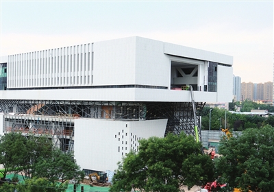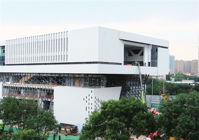 8月25日,万柏林区公共文化服务中心项目施工现场,施工人员正进行幕墙和装饰装修施工。该项目毗邻和平公园,集图书馆、文化馆、档案馆于一体。项目建成后,周边居民将在家门口享受“一站式”文化服务。王韵菲 摄