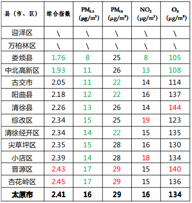 1.综合指数、PM10、NO2和O3指标排名前两位的标为绿色,排名后两位的标为红色;