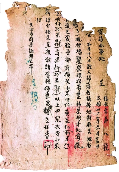 注①推测为“县长钧”三字,合为“县长钧鉴”,即报请县长审批。末尾“呈报7月18日”应为局长签字,表示文件已上报处理。虽然贸易局长和办事处主任同为吉一,但手续应该如此。②推测为“驻扎”或“骚扰”。③推测为寄藏粮食的户主名字。④推测为某种颜色的豆类名称。