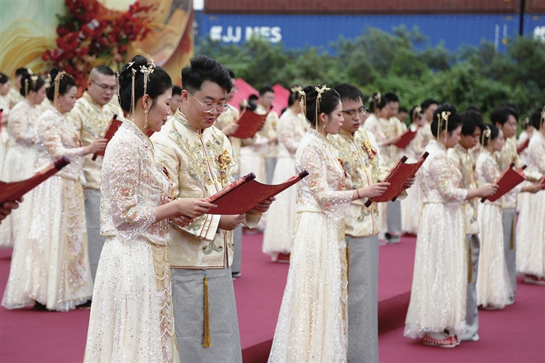 8月29日是传统节日七夕节,国铁太原局“缘在太铁 情定今生”职工集体婚礼在山西中鼎物流园区举行,50对新人携手成婚。此次集体婚礼,中华传统文化韵味十足、铁路元素满满,不仅有汇集书法、皮影、糖画等传统文化的市集,更将青年音乐节、太铁文创展示等青年职工喜闻乐见的元素融入其中,让集体婚礼成为了见证铁路青年职工爱情的浪漫舞台。耿婧媛 摄
