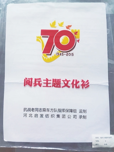 这件文化衫承载着纪念抗战胜利的诸多“唯一”。文化衫和手提袋上的纪念活动标识,由数字“70”、时间戳记“1945-2015”、V形长城图案及和平鸽形象构成,其专属规定使其成为历史的唯一。2015年天安门九三阅兵时,300多名抗战老兵(包括抗战老兵、支前模范代表及英烈子女代表)组成的方队作为第一方阵乘车受阅,其中还包括国民党老兵;而今年的大阅兵,综合考虑老战士身体状况等因素,不再组织老兵方队乘车受阅,而是安排参加过抗战的老战士、老同志、老民兵、地方支前模范代表及抗战烈士遗属代表到天安门现场观礼。因此,我珍藏的这件印有“抗战老同志乘车方队指挥保障组监制”的文化衫手提袋成了绝版,“抗战老同志乘车方队指挥保障组”也不复存在,这又是一份历史的唯一。