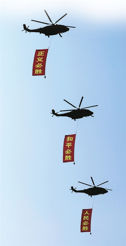9时44分,空中护旗梯队率先亮相,揭开阅兵分列式的序幕——3架直升机分别悬挂中国共产党党旗、中华人民共和国国旗、中国人民解放军军旗迎风向前,26架直升机组成巨大的“80”字样,3架直升机分别悬挂“正义必胜”“和平必胜”“人民必胜”条幅飞过天安门广场。