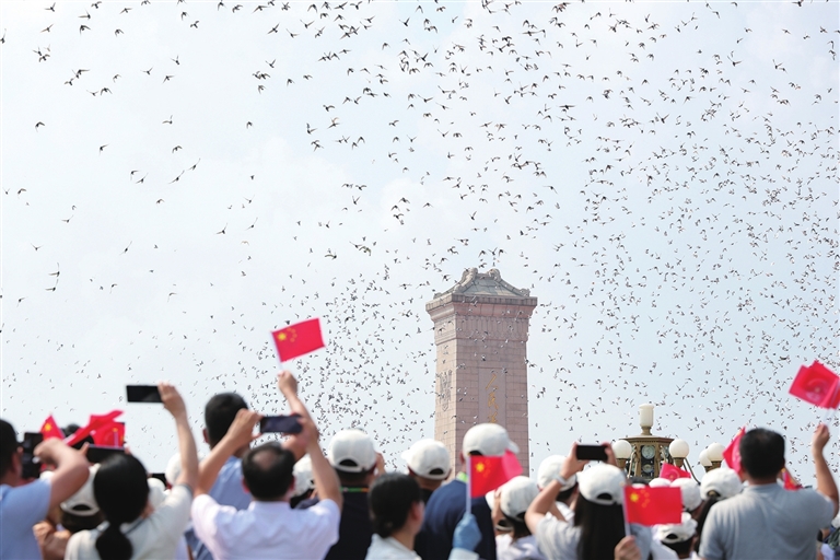 8万羽和平鸽展翅高飞,8万只气球腾空而起,《歌唱祖国》的激昂乐曲响彻整个广场。习近平等向各界群众频频致意,广场内外汇成一片欢腾的海洋。