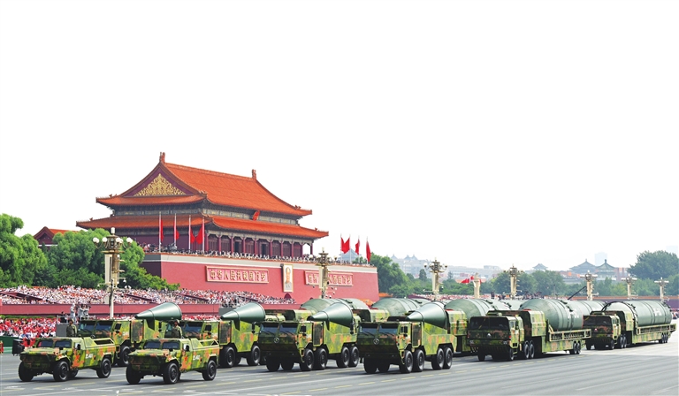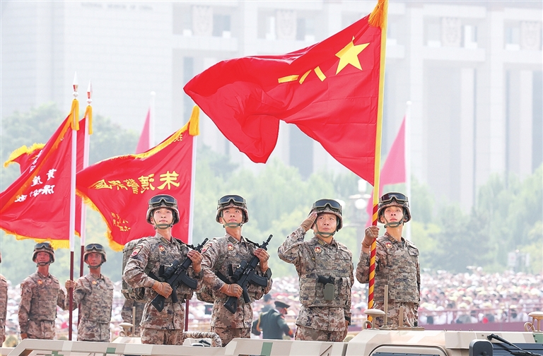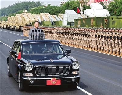 雄壮的军乐声中,习近平乘车沿着宽阔的长安街,依次检阅13个徒步方队、1个战旗方队、22个装备方队。受阅部队军容严整、意气风发,铁甲战车整齐列阵、威风凛凛。这是人民军队奋进建军百年的崭新亮相,这是中华民族捍卫世界和平的坚定宣示。