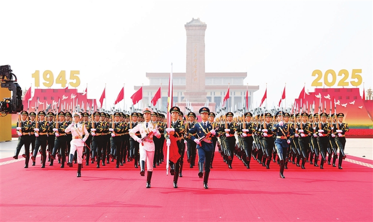 首都北京,花团锦簇,旌旗飘扬。天安门城楼庄严雄伟,天安门广场气象恢宏。人民英雄纪念碑前,“钢铁长城”主题景观巍然矗立,14座烽燧托举起“1945”“2025”字样,14只“和平鸽”振翅飞翔。从空中俯瞰,广场中“众”字造型观礼台蔚为壮观,象征着在中国共产党领导下中国人民万众一心、众志成城,向着中华民族伟大复兴昂扬奋进。