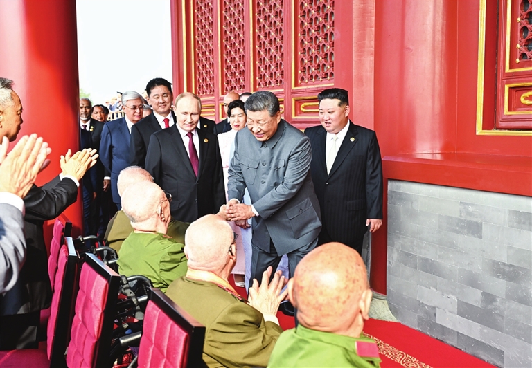 上午8时35分,习近平同出席大会的外方代表团团长拾级而上,登上天安门城楼。习近平同抗战老战士老同志代表亲切握手,向他们表示崇高敬意。