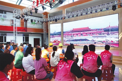在殷家堡社区、小马社区和康馨苑社区等地,党员、干部、工作人员和居民集中观看现场直播,在庄严仪式中铭记历史、凝聚奋进力量。当电视中出现国旗护卫队入场的画面时,全体人员起立高唱国歌,不少人眼含热泪。在地矿社区会议室内,大家跟随旋律齐声高唱,歌声铿锵有力。