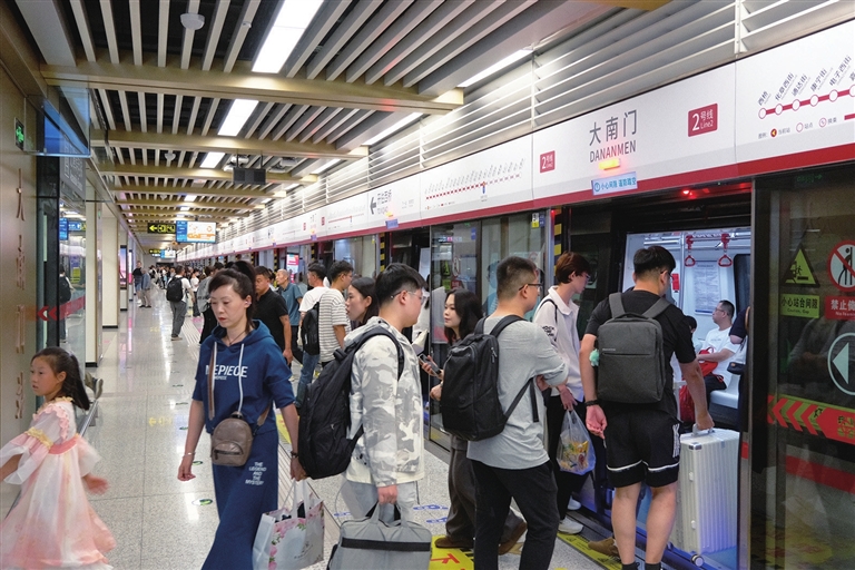 截至9月5日,太原地铁2号线累计客运量突破2亿人次。自开通运营以来,中铁电气化局太原中铁轨道公司已安全陪伴乘客走过1715个日夜。图为9月6日,太原地铁2号线大南门站,乘客络绎不绝。王韵菲 摄