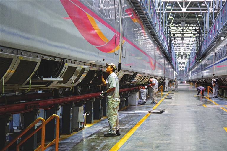 随着铁路暑运收官,中国铁路太原局集团有限公司太原车辆段动车所开始秋季整修。保障国庆、中秋等高峰期上线用车需求,提前做好动车组冬季防寒整备工作。图为9月7日,机械师们仔细检查列车的各个部件。王韵菲 摄