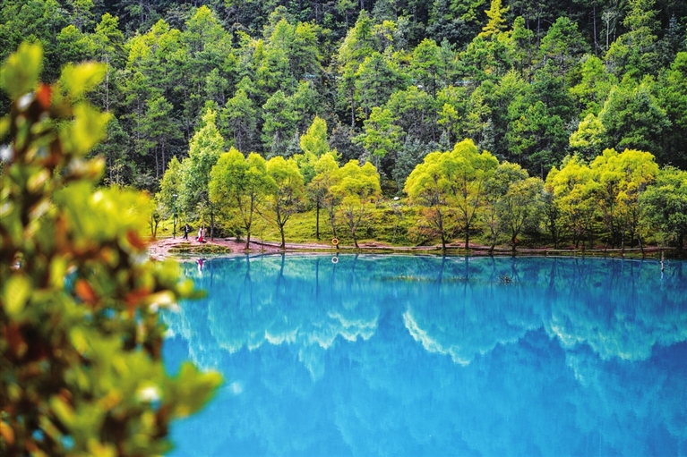 蓝月谷位于云南省丽江市玉龙雪山东麓甘海子以北、云杉坪南侧的山谷之中。9月,蓝月谷湖水充盈清澈,如同一颗颗蓝宝石镶嵌在山谷之中,吸引游客前来参观游览。新华社记者 金马梦妮 摄