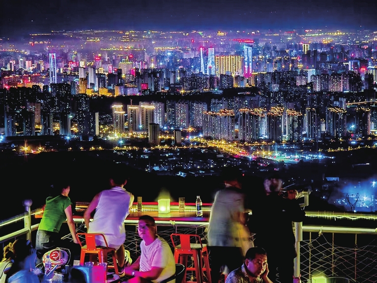 9月9日晚,玉泉山三星池观景平台,游客品美食、赏夜景。随着我市城市建设的逐步美化、亮化,城市夜景成为各景点吸引游客的新卖点,推动了夜间经济与文旅产业的发展。牛利敏 摄