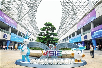 一座巨大的莫比乌斯环雕塑,矗立在智博会主会场外,象征高速畅通的“智能道路”图形上,印有全球知名智能企业和各类智能元素字样……