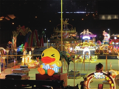 9月13日晚,迎泽区双塔汇商业广场的小黄鸭城市乐园已进入亮灯调试阶段,为正式开园作准备。该乐园位于永祚寺路与郝庄正街交会处,是我市首家儿童主题IP类开放式乐园。张昊宇 摄